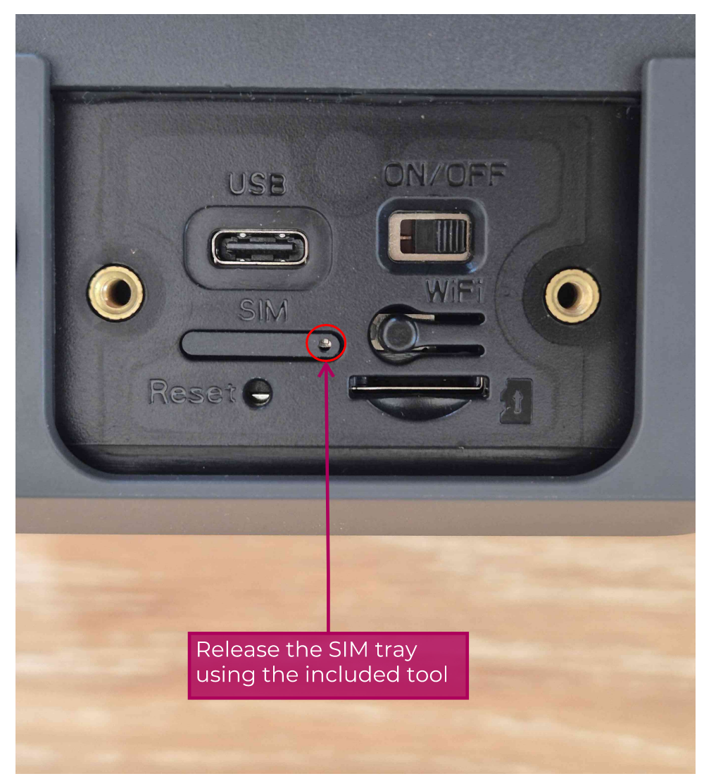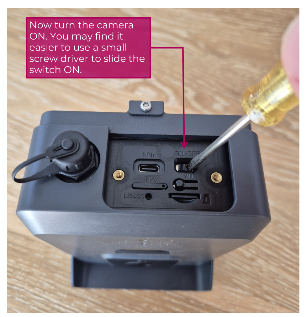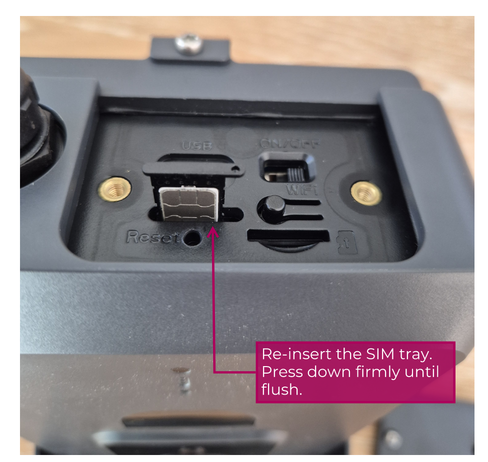 4. Re-insert the SIM tray back into the camera. Push down so it is flush with the camera surface. Note it does not 'click' in - but once pushed down it is secure and will require the tool to release again.